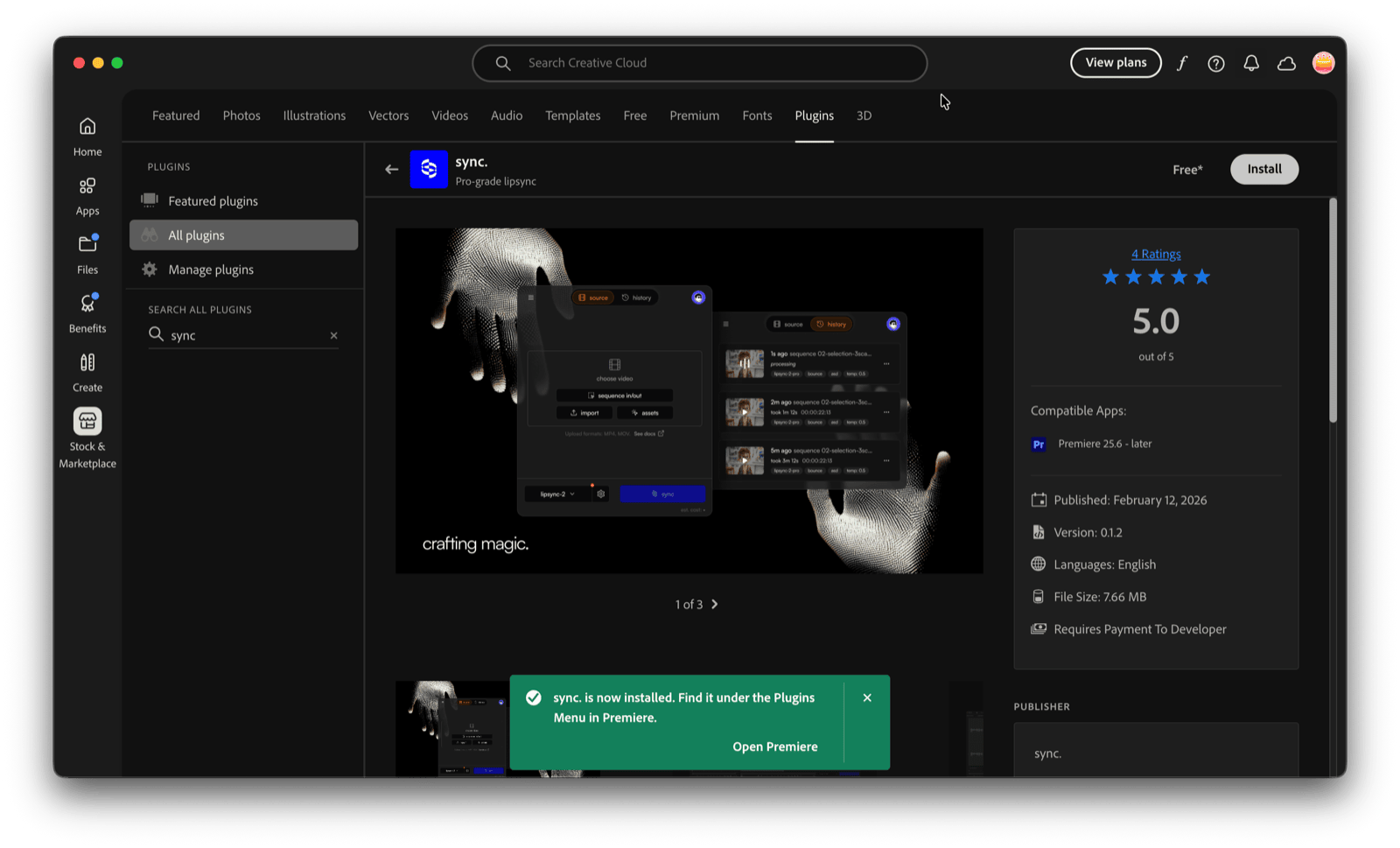 - Visit the Sync plugin on the Adobe Marketplace or search for Sync in Creative Cloud under Stock & Marketplace > Plugins.