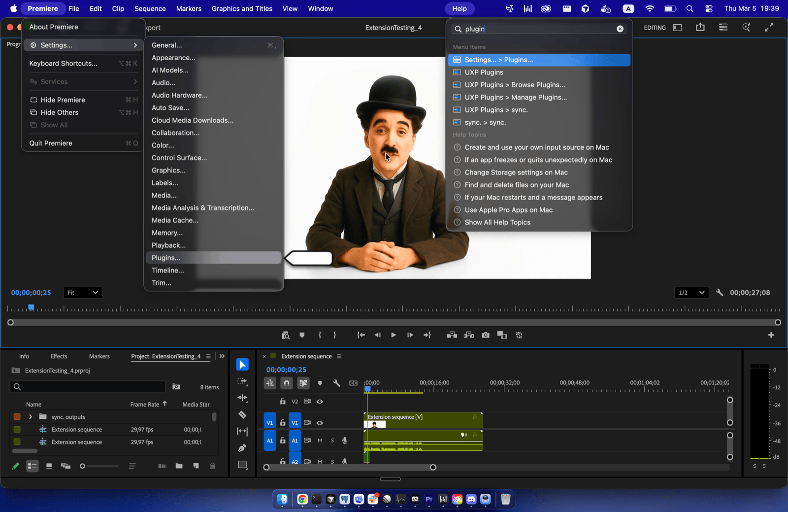 In Premiere Pro, go to Settings… > Plugins… — you can also find this by opening the Help menu and searching for “Plugins”.